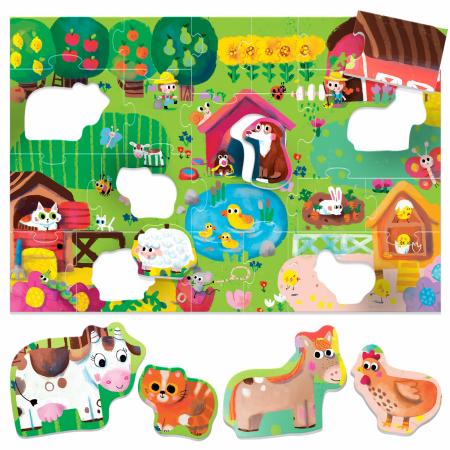 Componi il grande puzzle della fattoria e divertiti ad inserire gli animali negli spazi corrispondenti. Il puzzle è composto da 19 grandi pezzi e 6 animali sagomati.